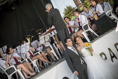 Pensamos que este será um dos motivos pelos quais, de quando em vez, recebemos presentes que nos deixam um calorzinho no coração. Foi o que aconteceu há uns meses, quando uma nossa antiga clarinetista entrou de novo pela nossa porta em dia de ensaio e nos veio cumprimentar. Claro que isso bastaria para ficarmos felizes, mas mais felizes ficámos quando a nossa menina crescida nos apresentou o seu noivo e nos fez o amável convite de actuar no seu casamento. Foi o que fizemos no passado sábado, no largo da igreja de Riachos, perante um vasto auditório de bem vestidos convidados. Um grande obrigado por tudo o que nos deste e por te lembrares de nós neste momento tão importante.